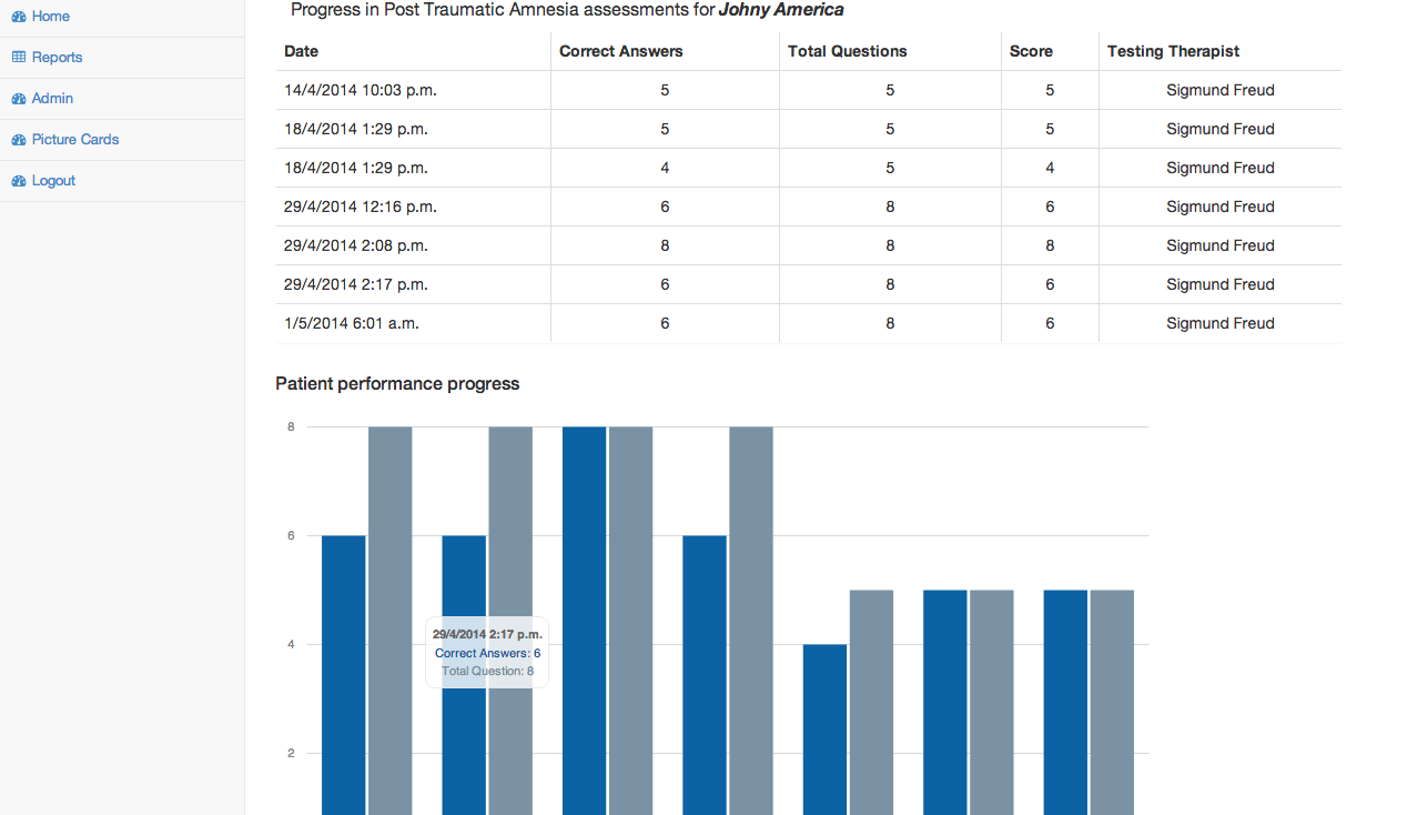 In this day and age we all realise that storing information is important, but once we store raw information, then what do we do with it? We aim to address it in this application by presenting raw information via graphs and tables in an attempt to make it more meaningful. Reporting requirements can be highly specific to individual needs and hence no attempt is made to present a one size fits all solution. What we have done in this application is built a framework for reporting that can be enhanced further with ease to cater for more specifc reporting needs. The screenshot to the right shows an example demonstrates how the application presents the information for patient assement progress
