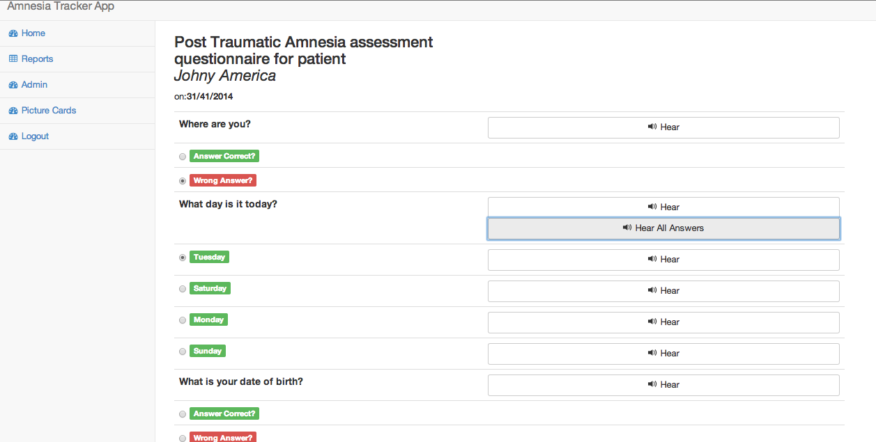 At any given time the App will only display the questions that have been entered by staff responsible for the post traumatic amnesia assessment at the medical facility. The questions seen on the screenshot to the left are an example of such customisation.